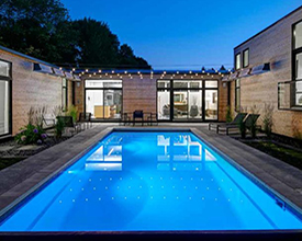 Romanesque fiberglass pool shapes take a cue from the villas of ancient Rome, with two long straight edges flanked by arched half-circles at either end. This timeless shape will imbue your pool area’s chic minimalism with elegance. Kidney-shaped pools offer a sleek, contemporary feel and their asymmetrical shape fits easily into smaller spaces without sacrificing style.